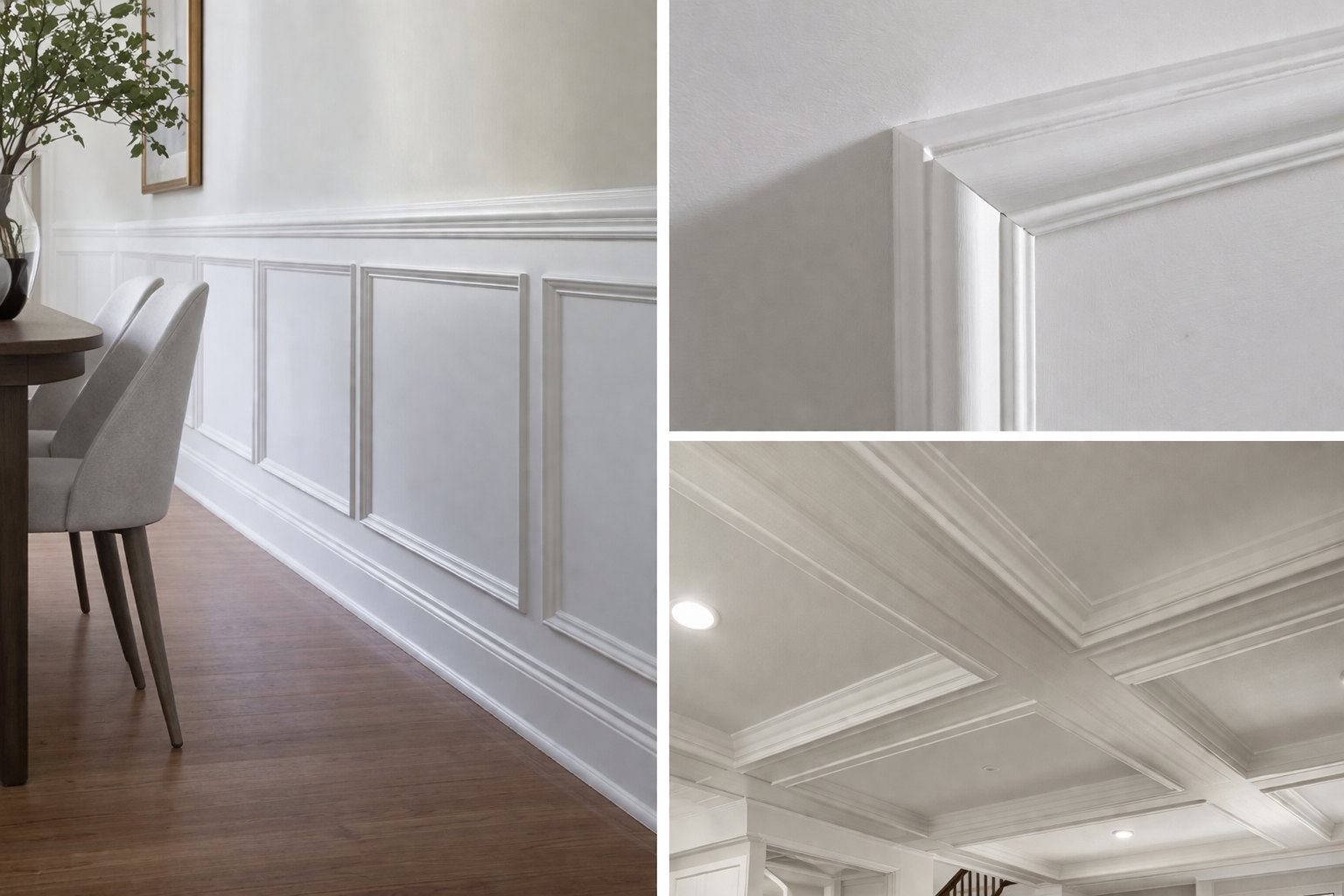 Panel moulding takes this further — used to create rectangular or square frames on walls and ceilings that add depth, dimension, and traditional craftsmanship to otherwise flat surfaces.